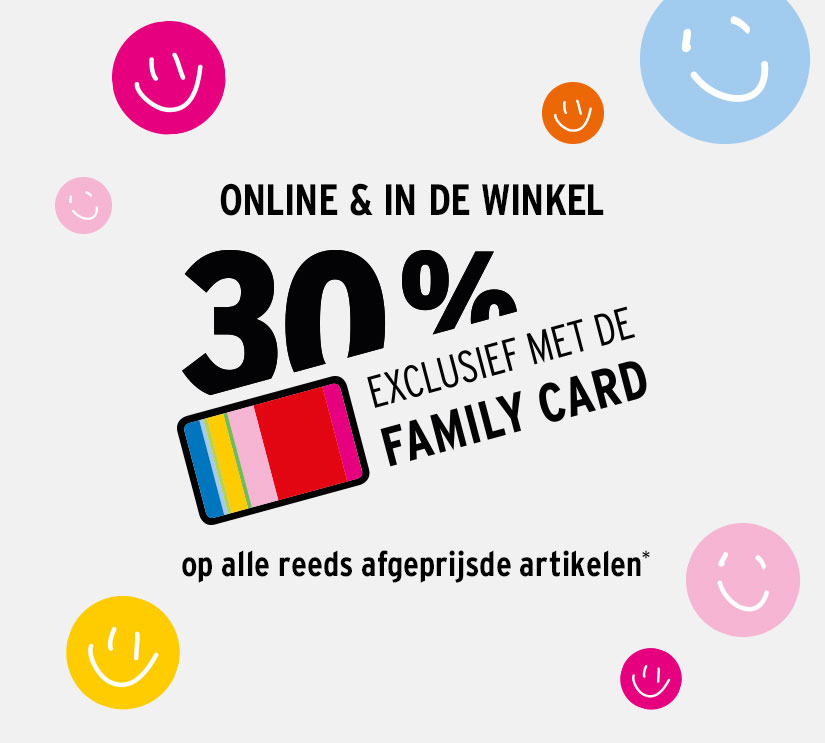 De korting is geldig van 09-01-2026 tot 11-01-2026 voor alle reeds afgeprijsde artikelen en uitsluitend met de Family Card. Geldig in de onlinewinkel, de app en bij alle winkels van Ernsting's family. Online exclusieve artikelen kunnen in alle winkels van Ernsting's family besteld worden. Dit geldt niet voor tegoedbonnen, verzendkosten en boeken die onder de vaste boekenprijs vallen. Online bestellingen kunnen na afhaling in het filiaal niet nog van een korting worden voorzien. Niet combineerbaar met andere (actie-)kortingen. De korting wordt aan het einde van het betalingsproces automatisch berekend.