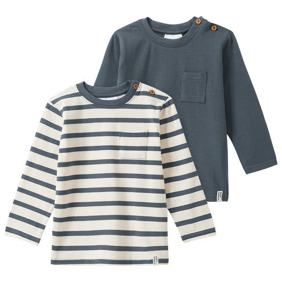 Twee shirts met lange mouwen van gecertificeerd biologisch katoen met een ronde halslijn. In effen blauwgrijs en crèmewit met horizontale strepen. Elk met een praktische schouderknoop en opgestikte borstzak links.