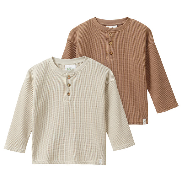 Twee shirts met lange mouwen en een fijne wafelstructuur in blauwgrijs en donkerblauw. Ronde hals met korte knoopsluiting aan de voorkant. Licht verlaagde schouders. Klein "puur natuur"-label op de zoom.