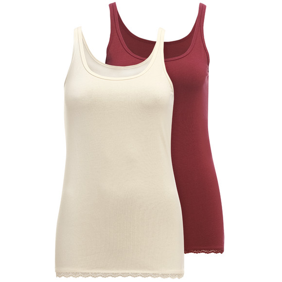 Onderhemden in effen zwart en lichtbruin met luipaardmotief. Met ronde hals, brede bandjes en kanten randje aan de zoom. Aansluitend en licht getailleerd model.
