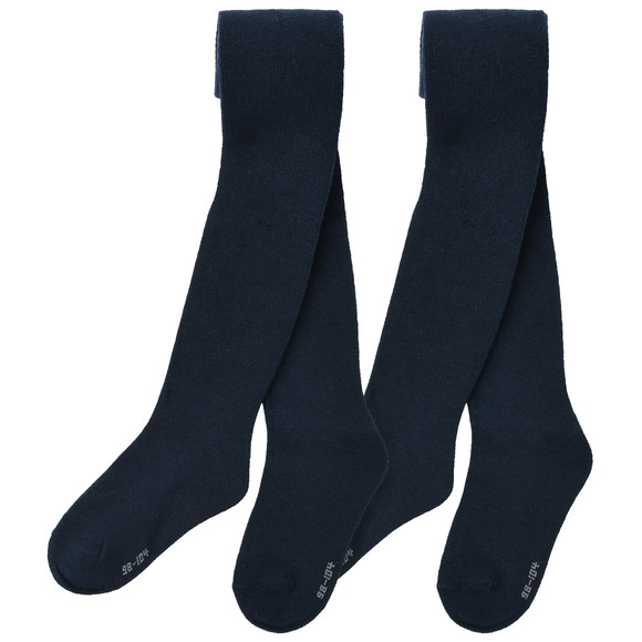 Twee paar panty's van een zachte biologische katoenmix in donkerblauw. Met een elastische geribde tailleband voor een comfortabele pasvorm.