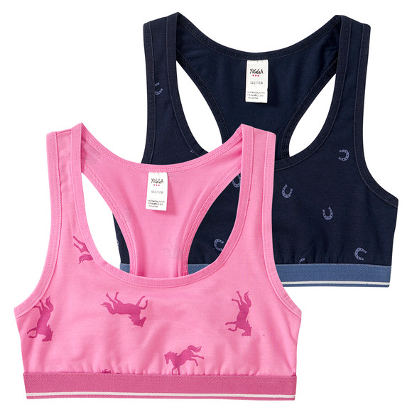Twee bustiers in blauw en wit met paardenmotieven als all-overpatroon. Elk met een racerback en brede onderborstband voor een aangenaam draagcomfort. Voorkant dubbel gelaagd.
