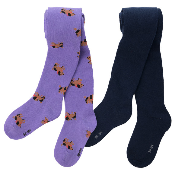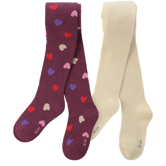 Twee paar panty's in roze met kersen all-over en effen donkerrood. Elk met een elastische tailleband voor optimaal comfort.