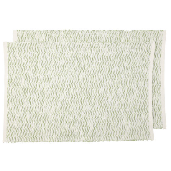 Twee katoenen placemats in saliegroen met geribbelde structuur. Met gekarteld patroon all-over. Met omzoomde randen aan de korte zijden.