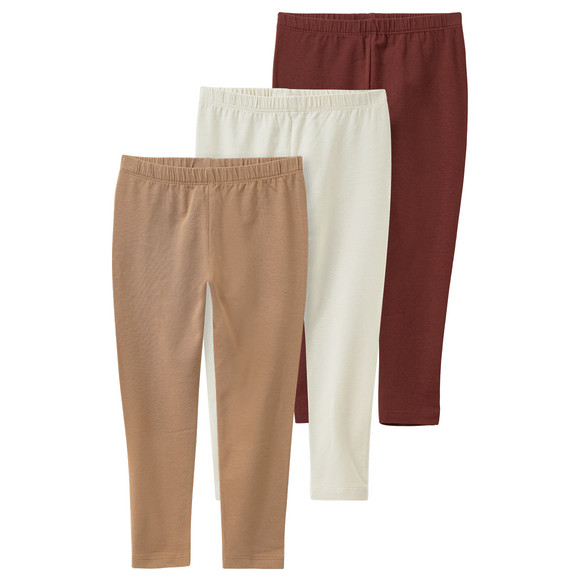 Drie basic leggings van organisch katoen in lichtbruin, donkerrood en crèmewit. Elastische tailleband voor een comfortabele pasvorm. Het Global Organic Textile Standard-zegel (GOTS) garandeert de hoogste milieu- en sociale normen voor productieprocessen en het gebruik van katoenvezels van gecontroleerde biologische teelt. Daarom is dit product duurzaam.