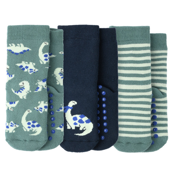 Drie paar stopper sokken in donkergroen met dino all-over, in donkerblauw met dino motief en in donkergroen met lichtgroene strepen all-over. Elk met elastische manchetten en antislipnoppen op de zool voor een stevige voet.