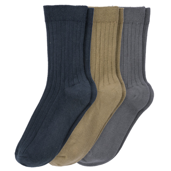 Drie paar sokken van gecertificeerd biologisch katoen in gedekte kleuren. Eén paar elk in olijf, donkerblauw en donkergrijs. Met een geribde structuur en elastische tailleband voor een comfortabele pasvorm.