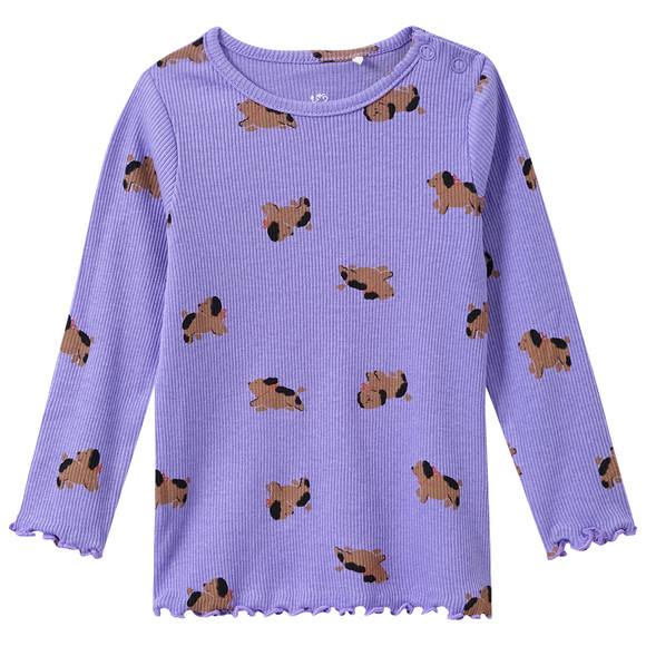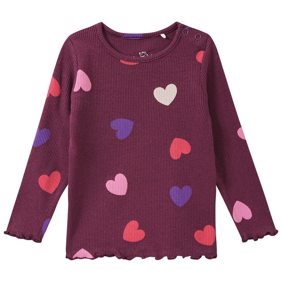 Donkerrood shirt met lange mouwen en een all-over hartendessin. Met een geribde textuur en praktische schouderknopen bij de ronde hals.