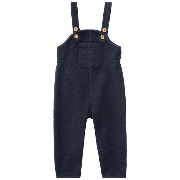 Alleen het beste voor de kleine schat! Donkerblauwe wollen tuinbroek met knopen in houtlook op de dubbel verstelbare bandjes. Met elastische inzetstukken aan de zijkanten en een opgestikte borstzak aan de voorkant. Royaal gesneden met praktische omslagboorden aan de pijpen, voor optimaal draagcomfort, ook over meerdere lagen kleding.