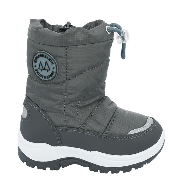 Donkergrijze winterlaarzen in een combinatie van imitatieleer en stof met een structuurpatroon. Trekkoord met stopper op de gewatteerde schacht. Zijrits met bescherming tegen binnendringend vocht. Diverse reflecterende elementen. Loopzool met profiel voor een goed loopgevoel. Behaaglijke binnenvoering van teddy-pluche.