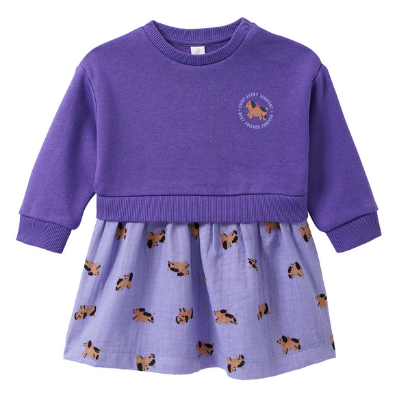 Dress met een roze sweatshirt-look top en bijpassende mousseline rok met all-over kussentjes. Met geribde boorden en drukknopen bij de ronde hals, armsgaten en zoom van de top. Kleine print op de borst.