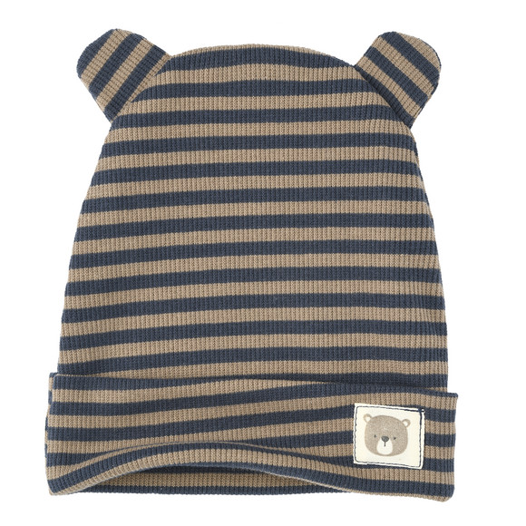 Bruin-blauw-grijs gestreepte, dubbellaagse muts met fijne ribstructuur en met oren-applicatie. Met omslagband en stofapplicatie met teddybeermotief.