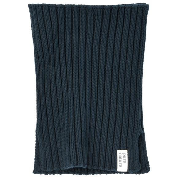 Donkerblauwe buisvormige sjaal van biologisch katoen met een geribde gebreide textuur. Met zijsplitten aan één uiteinde en een klein "puur natuur" label. Afmetingen ca. 17 x 21 cm (bxl).