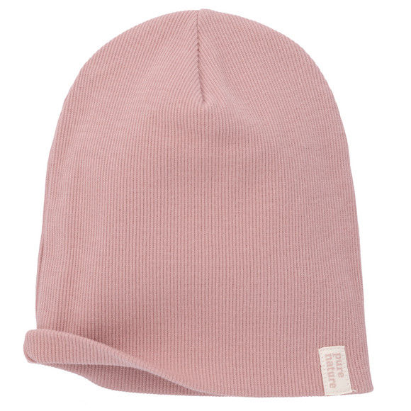 Poederroze geribbelde beanie met twee lagen en een klein “pure nature”-label.