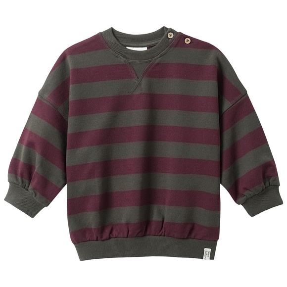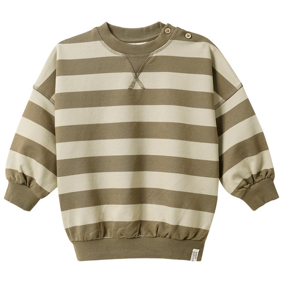 Sweatshirt van gecertificeerd biologisch katoen met blokstrepen in olijfgroen en lichtbeige. Met praktische schouderknopen aan de ronde hals, losjes gesneden schouders en een klein "puur natuur"-label op de zoom. Alle halslijnen met geribde boorden. Licht geborsteld aan de binnenkant.