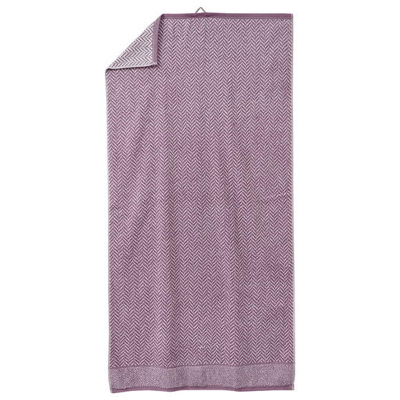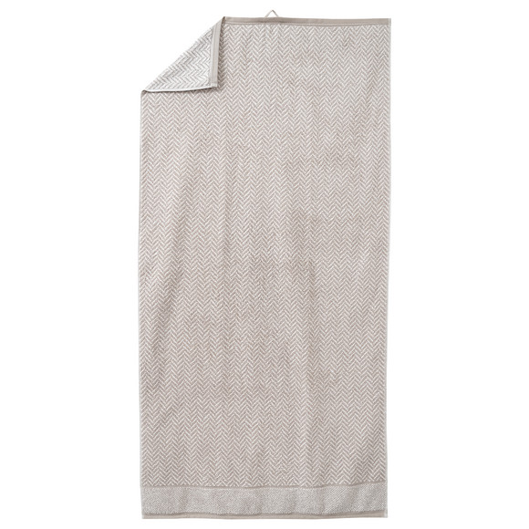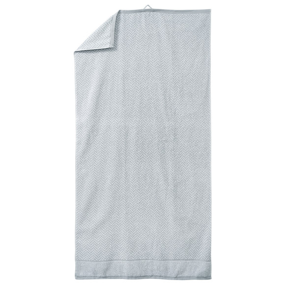 Lichtgrijze en witte badhanddoeken met visgraatmotief en huidvriendelijke badstof van hoge kwaliteit. Omboord met bies en praktische lus om op te hangen.