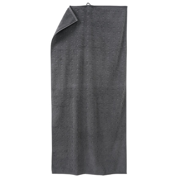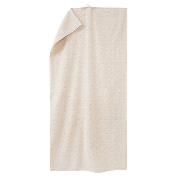 Bordeauxrode badhanddoek van absorberende badstof met een geweven patroon van kleine vierkantjes. Rondom afgewerkt met een zoom en voorzien van een handige lus om op te hangen.
