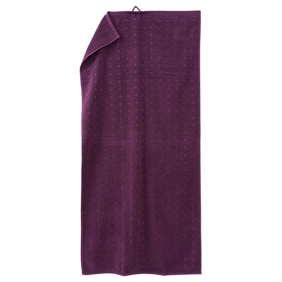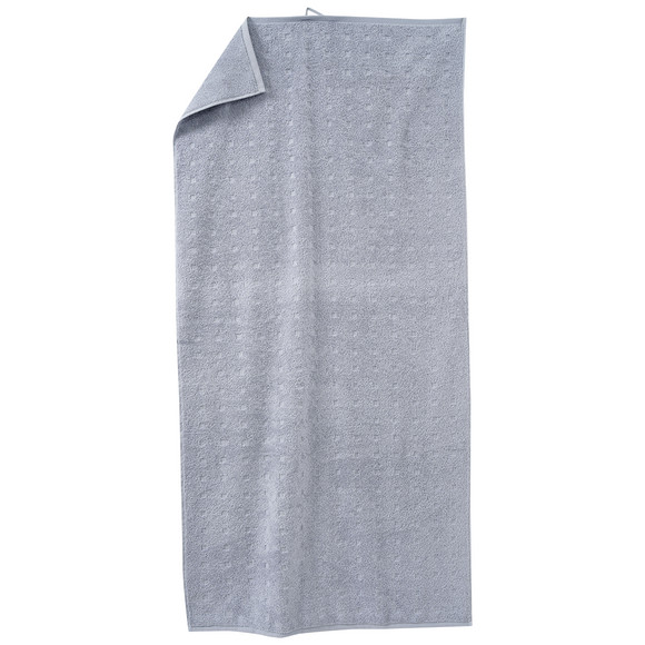 Lichtgrijze douchehanddoek van absorberende badstof met een geweven patroon van kleine vierkantjes. Rondom afgewerkt met een zoom en voorzien van een handig lusje om op te hangen.