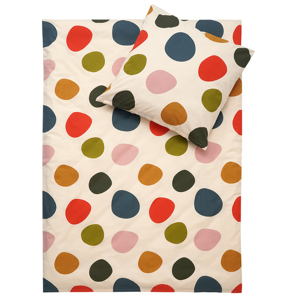 Crème wit Renforcé beddengoed van comfortabel katoen met kleurrijke stippen over het hele bed. Zeer slijtvast en sluit met een rits. Dekbedovertrek ca. 135 x 200 cm. Afmetingen kussensloop ca. 80 x 80 cm (bxl).