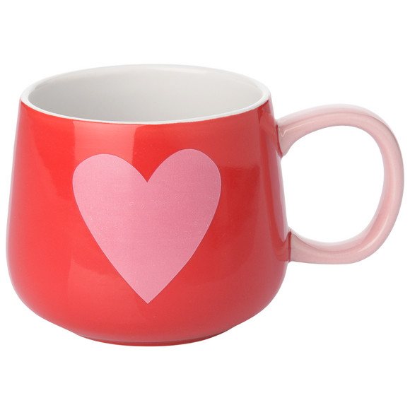 Rode mok met grote roze hartjes en een rood hartje op de bodem. In Valentijnsdag-design. Met grote oor.
