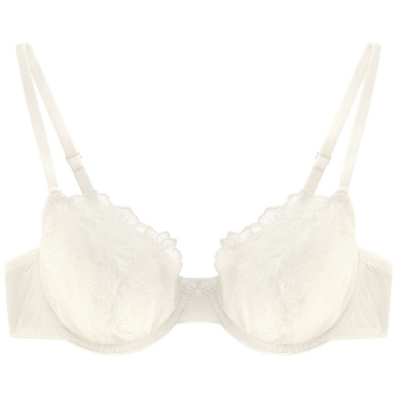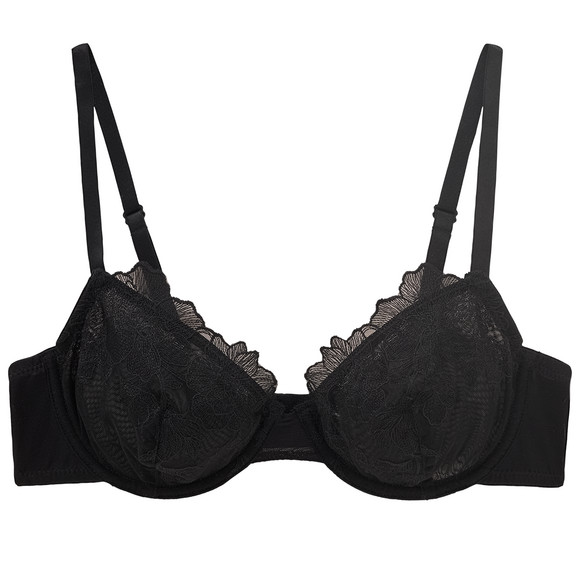 Zwarte zachte bh van soepele microvezel met zwart gebloemd kant op de ongevoerde cups. Drievoudig in breedte verstelbare onderbusteband. Perfecte pasvorm dankzij haakjessluiting op de rug. Elastische bandjes met verstelbare lengte.