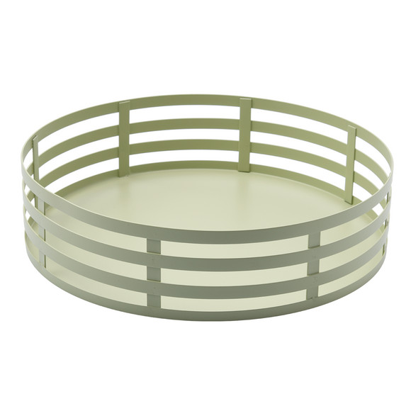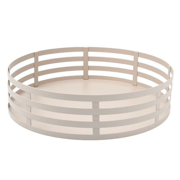 Beige decoratief dienblad in ronde vorm van metaal.