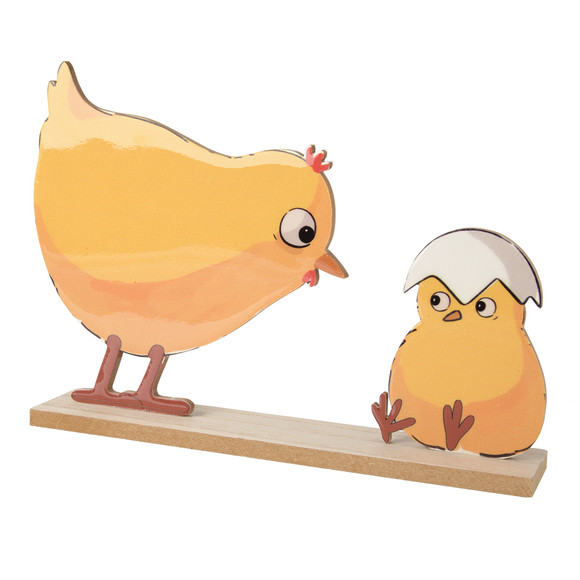 Decoratieve houder in de vorm van twee kuikens in geel hout. Ideaal voor Pasen.
