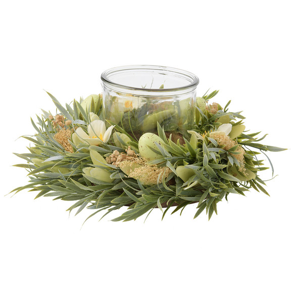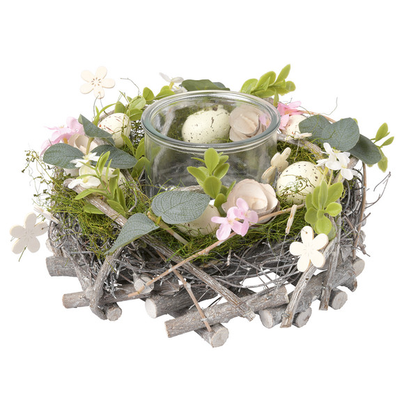 Deco-krans van gebonden takken met kunstbloemen en -bladeren en roomwitte decoratie-eieren. In het midden met helder windlicht. Zonder theelichtje. Ø ongeveer 25 cm.