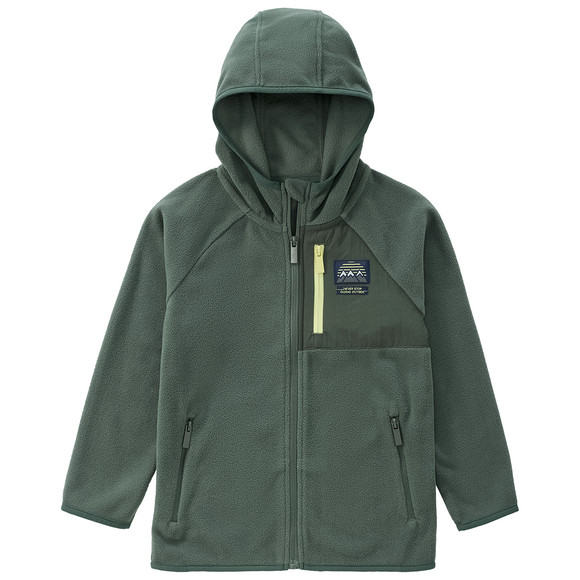 Zacht fleece jack in donkerblauw gemaakt van gerecycled materiaal. Met capuchon, doorlopende rits met kinbescherming en drie zakken. Kleuraccent op de linkerborst.