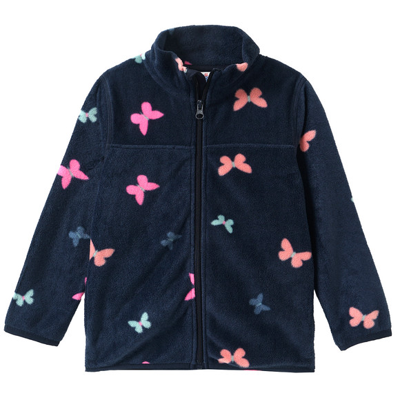 Donkerblauwe jas van zacht fleece met roze accenten. Met twee steekzakken aan de voorkant en biezen bij de armsgaten en zoom. Opstaande kraag en kinbeschermer aan de ritssluiting. Normale pasvorm.