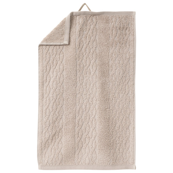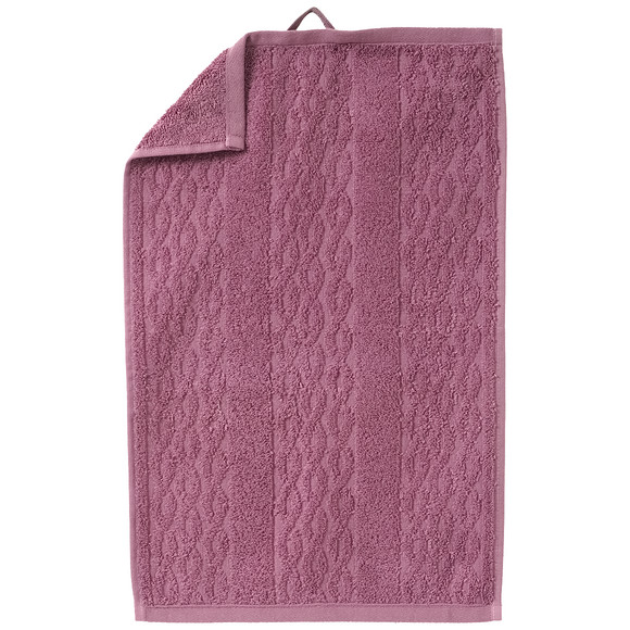 Gastenhanddoek in donkerpaars van sterk absorberende badstof met kabelpatroon. Rondom omzoomd en met een praktische lus om op te hangen.
