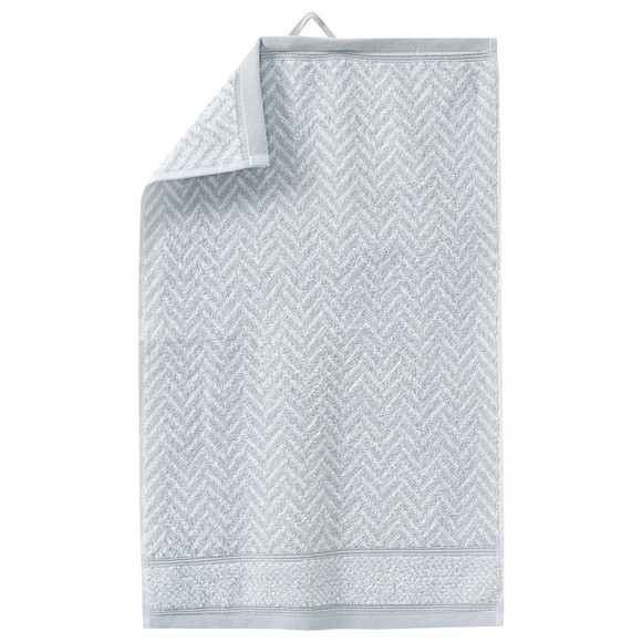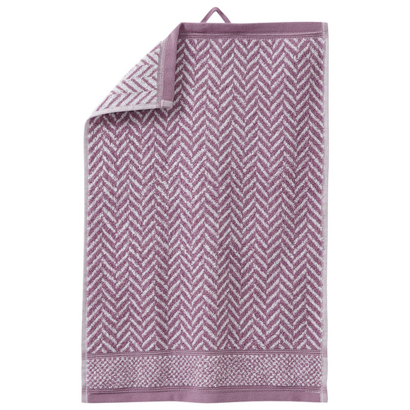 Paars-witte Gastendoekjes met visgraatmotief en hoogwaardige, huidvriendelijke badstof. Omboord met bies en praktische lus om op te hangen.