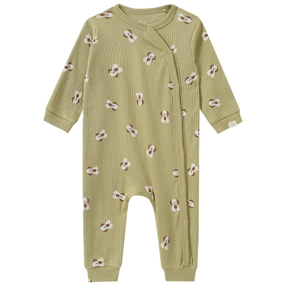 Eéndelige pyjama van biologisch katoen, in licht olijfgroen met een geribde textuur en all-over honden. Drukknoopsluiting over de hele lengte voor gemakkelijk aan- en uitkleden. Aansluitende manchetten en beenopeningen.
