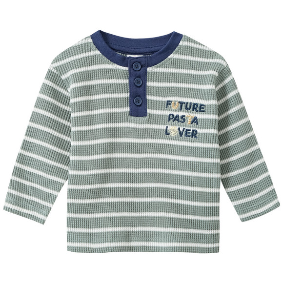 Salviakleurig shirt met lange mouwen, fijne wafelstructuur en witte strepen. Donkerblauwe henleyhals met korte knoopsluiting aan de voorkant. Met pastaborduursel op de borst.
