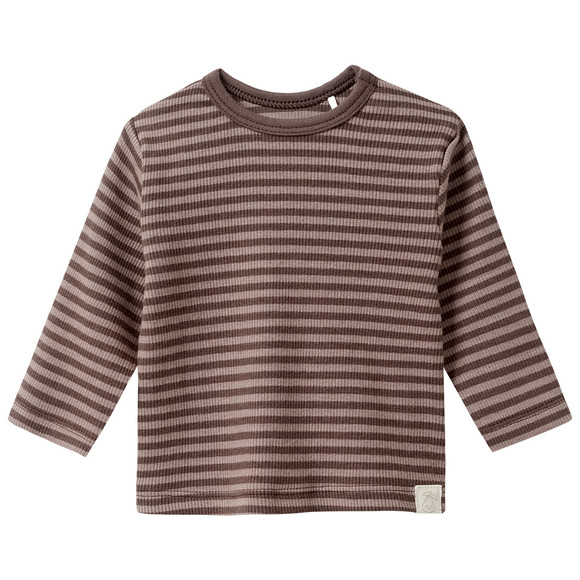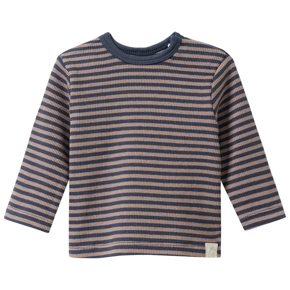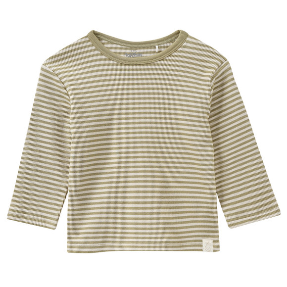 Olijfgroen gestreept shirt met lange mouwen van gecertificeerd biologisch katoen met een geribde textuur. Ronde hals met praktische schouderknopen. Kleine patch op de zoom.