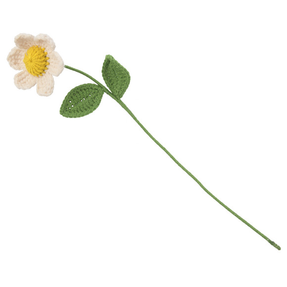 Gebreide bloem van metaal bedekt met textiel. Met twee groene bladeren en een witte bloem. Ideaal voor Pasen.