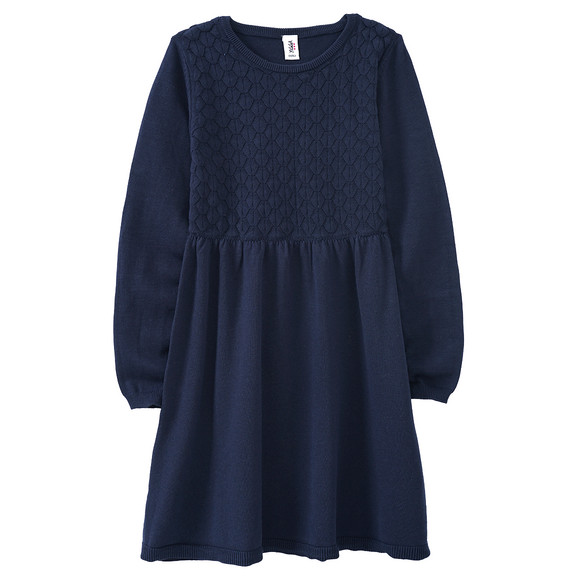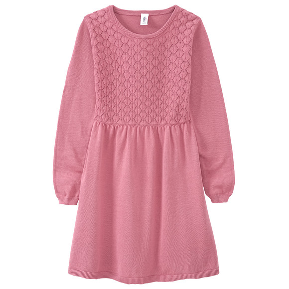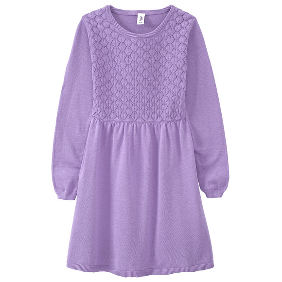 Lichtpaarse gebreide jurk met een honingraatstructuur aan de voorkant en lange mouwen. Met geribde boorden bij de ronde hals, armsgaten en zoom. Licht uitlopend rokgedeelte.