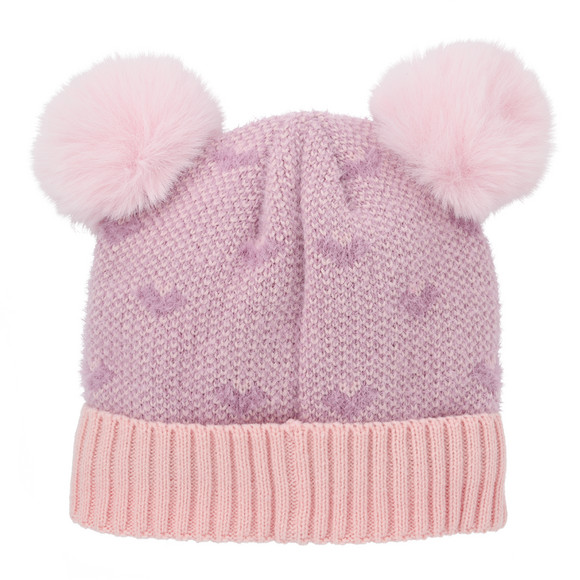 Roze gebreide muts met hartjes in een all-over dessin en twee gezellige roze bobbels. Met een brede geribde boord en gevoerd met zachtroze fleece aan de binnenkant.