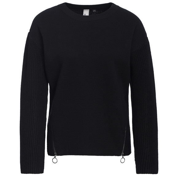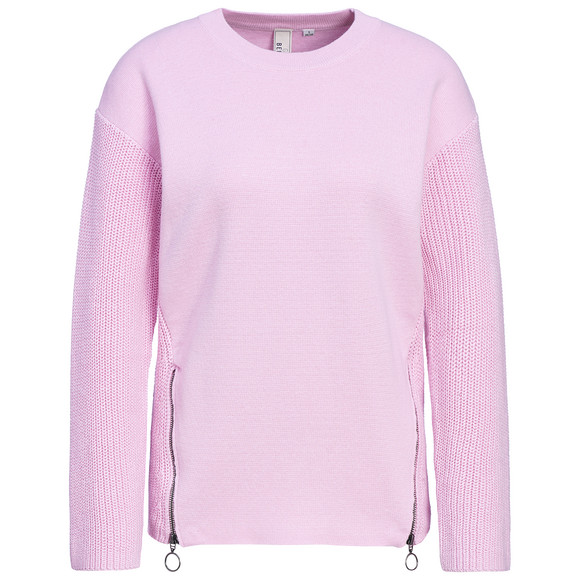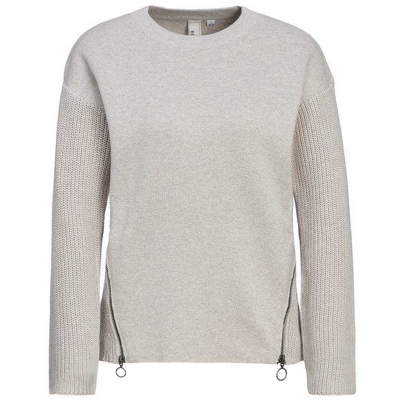 Beige gebreide trui met ronde hals, ribgebreide mouwen en sierritsen vooraan. Rechte snit.