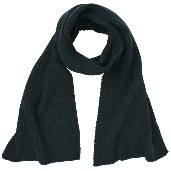 Donkerblauwe sjaal van zacht ribbreisel. Afmetingen ca. 25 x 160 cm (bxl).