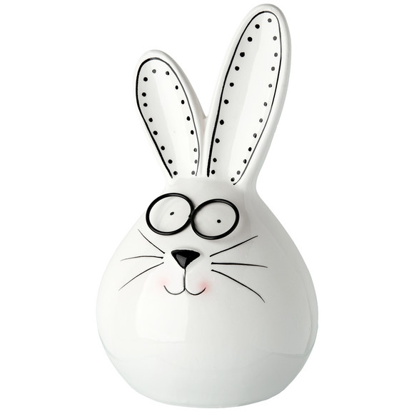 Groot hazenfiguur gemaakt van glanzend wit keramiek. Met details op de oren en opgezette, goudkleurige metalen bril.