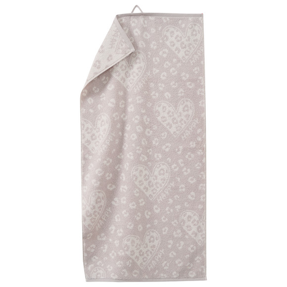 Beige-zwarte katoenen handdoek van hoge kwaliteit en huidvriendelijke badstof. Met hartjes all-over aan beide zijden. Randen afgewerkt met biesjes en met praktische lus om op te hangen.