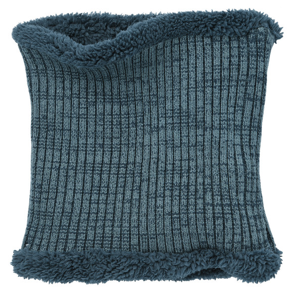 Donkerturquoise ribgebreide ronde sjaal met fijne strepen in donkerblauw. Zacht gevoerd met teddy-pluche. Afmetingen ca. 24 x 24 cm (bxl).