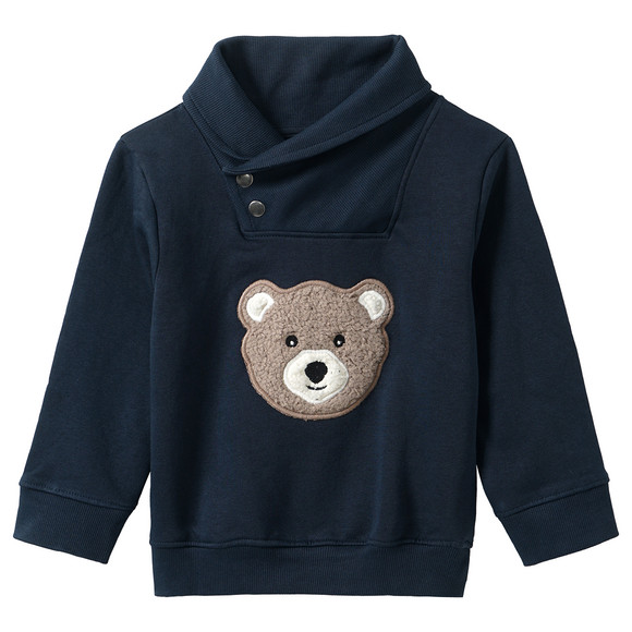 Donkerblauwe sweater met drukknopen op de geribde sjaalkraag en grote berenapplicatie op de voorkant. Met vormvaste manchetten en zacht geborstelde binnenkant.