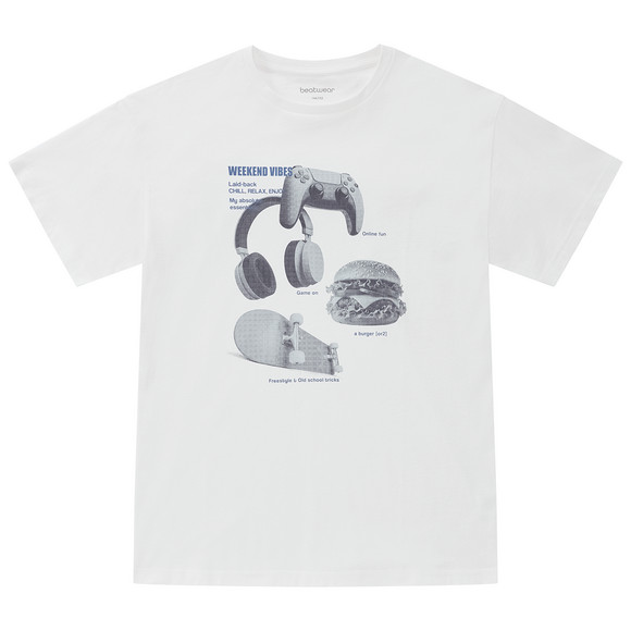 Wit T-shirt met grote print op de voorkant. Met geribbelde boord aan de ronde hals en een casual pasvorm.