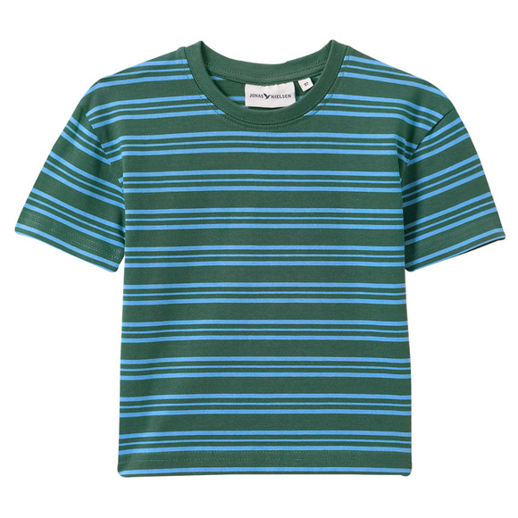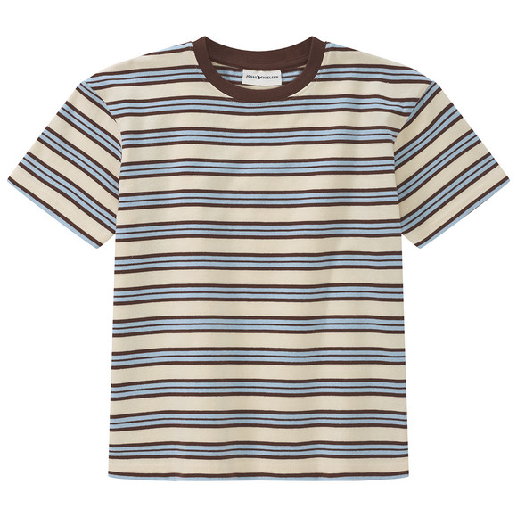 Frambozenkleurig T-shirt van gecertificeerd biologisch katoen met witte en lichtblauwe strepen. Ronde hals met fijn geribde manchetten.