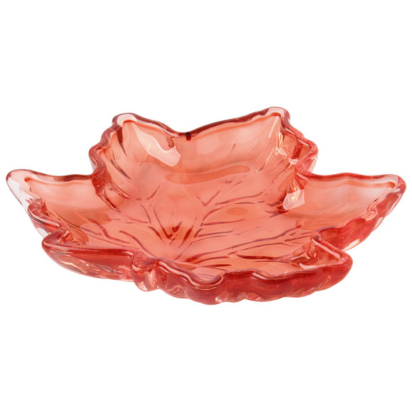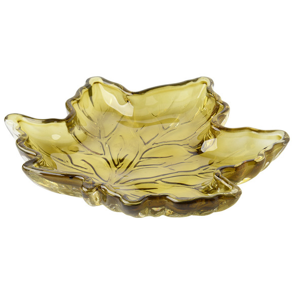 Kandelaar van groen glas in esdoornvorm voor één kaars. Afmetingen ca. 14 x 12 x 2 cm (BxLxH).