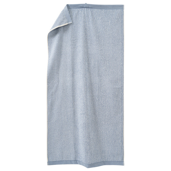 Blauw-crèmekleurige badstoffen douchehanddoek met strepen all-over. Omzoomd en met handige lus om op te hangen.