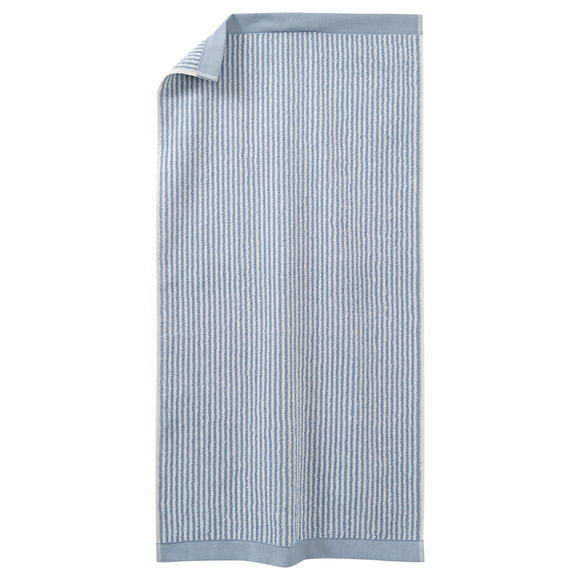 Blauw-crèmekleurige handdoek van zachte badstofkwaliteit met strepen all-over. Omzoomd en met handige lus om op te hangen.