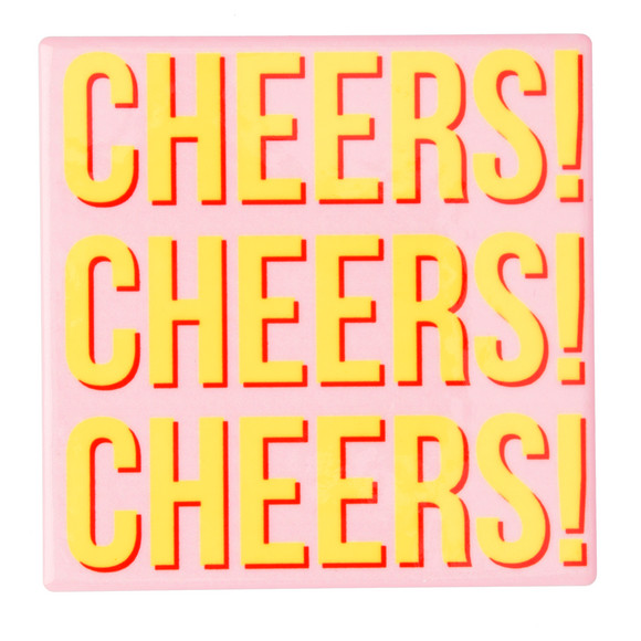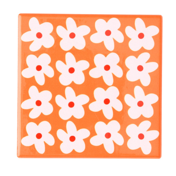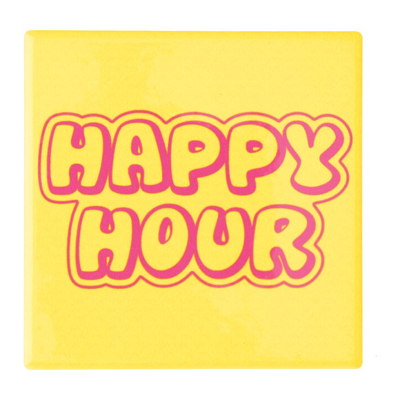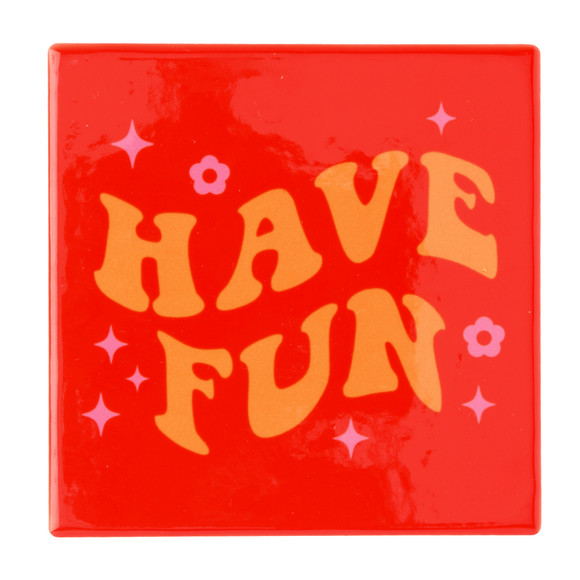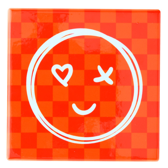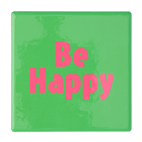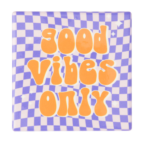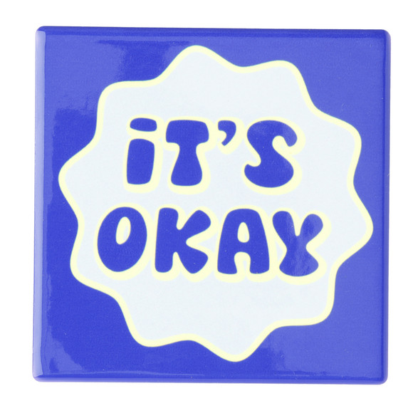 Keramische onderzetter met een glanzend oppervlak en een donkerblauw 'it’s okay’-opschrift op een lichtblauwe achtergrond in gegolfde vorm. Vorm en tekst op donkerblauwe achtergrond. Onderkant van kurk voor slipvastheid.